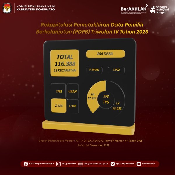 Pohuwato, kab-pahuwato.kpu.go.id - Berdasarkan Berita Acara Nomor: 99/TIK.04-BA/7504/2025 tanggal 6 Desember 2025, KPU Kabupaten Pohuwato menetapkan KPU Kabupaten Pohuwato menetapkan jumlah data pemilih berkelanjutan Triwulan IV Tahun 2025 sebanyak 116.388 pemilih, yang terdiri dari 58.831 laki-laki dan 57.557 perempuan, yang tersebar di 13 (Tiga Belas) Kecamatan. Yuk segera cek apakah kamu sudah terdaftar sebagai pemilih di https://cekdptonline.kpu.go.id/ BA REKAP DPB TRIWULAN IV TAHUN 2025 UNDUH DISINI SALINAN KPT 44 TAHUN 2025_REKAP PDPB TRIWULAN IV TAHUN 2025 ....