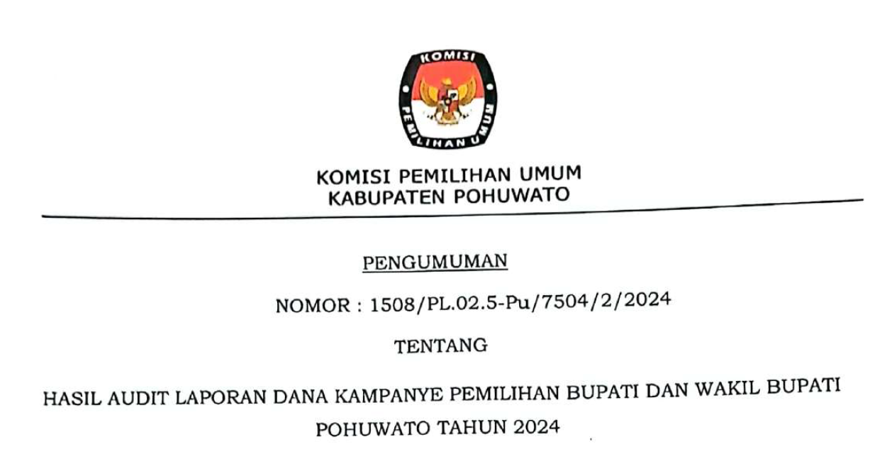 PENGUMUMAN HASIL AUDIT LAPORAN DANA KAMPANYE PEMILIHAN BUPATI DAN WAKIL BUPATI POHUWATO TAHUN 2024