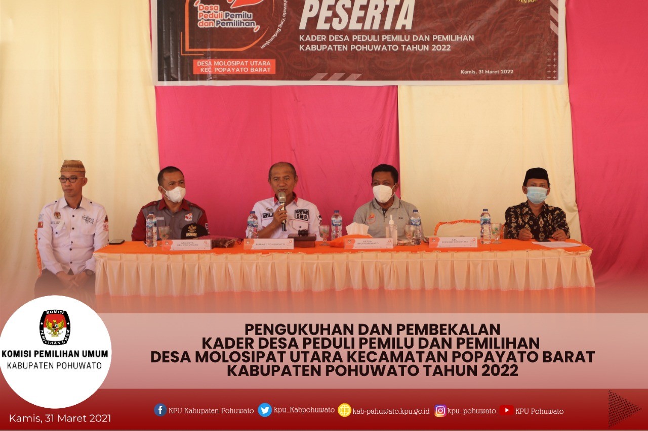 Pohuwato - Komisi Pemilihan Umum Kabupaten Pohuwato (KPU Pohuwato) memberi pembekalan dan mengukuhkan 25 peserta Kader Desa Peduli Pemilu dan Pemilihan. Kegiatan yang dilaksanakan di Desa Molosipat Utara Kabupaten Pohuwato, Kamis (31/03/2022), dibuka Bupati Pohuwato Saipul A. Mbuinga. Dalam sambutannya, Saipul A. Mbuinga menyampaikan bahwa pihaknya selaku pemerintah daerah sangat mendukung kegiatan yang dilaksanakan KPU Pohuwato karena merupakan hal penting bagi proses demokrasi di Pohuwato. “Kegiatan ini sangat penting, karena proses demokrasi itu berhasil dengan tingkat sumbangsih masyarakat untuk mengambil bagian dalam mensukseskan pemilu, untuk menjadi pemilih yang peduli dan punya partisipasi besar karena ini akan dikembalikan lagi untuk kebutuhan sebesar-besarnya untuk rakyat”, ungkapnya. Kepada peserta, Bupati mengatakan, dalam upaya meningkatkan kesadaran masyarakat khususnya pemilih untuk mengambil bagian dalam rangka untuk menyukseksan pemilu dan pemilihan nanti, maka tugas yang akan anda pikul menjadi sangat mulia demi kebaikan proses demokrasi. Saipul berpesan kepada para kader untuk mengikuti kegiatan ini dengan baik. Ia berharap apa yang menjadi harapan kita bersama untuk mensukseskan proses demokrasi pemilu dan pemilihan 2024 bisa berjalan dengan baik. Ketua KPU Pohuwato Rinto W.Ali dalam sambutannya mengatakan, kegiatan desa peduli pemilu dan pemilihan, merupakan salah satu agenda prioritas KPU Pohuwato yang bertujuan meningkatkan partisipasi masyarakat serta mewujudkan pemilih yang mandiri yang tidak terkontaminasi dengan politik uang. Selain itu Komisioner 2 periode ini mengucapkan terimakasih kepada Bupati Pohuwato telah bersedia hadir membuka dan mengukuhkan para kader desa peduli pemilu dan pemilihan. Rinto W. Ali juga berharap bahwa para kader bisa memberikan penguatan yang secara sukarela menyampaikan kembali kepada masyarakat tentang pentingnya pemilu dan pemilihan dalam kehidupan berbangsa dan bernegara. Para kader Desa Peduli Pemilu kemudian dibekali materi. Materi pertama disampaikan Koordinator Divisi Teknis Penyelenggaraan Mohamad Iskandar U. Alulu didapuk membawakan materi Sistem dan Tahapan Pemilu dan Pilkada. Diilanjutkan dengan materi dari Ketua Bawaslu Pohuwato Ramlan perihal Pendidikan Pemilih dalam Pencegahan Politik Uang. Sementara itu, Firman Ikhwan selaku Divisi Perencanaan, Data dan Informasi yang menjelaskan terkait Teknik Komunikasi Publik. Untuk sesi ke II diawali dengan materi"Teknik dan Metode Identifikasi Pencegahan Berita Bohong (Hoaks) dari Anggota KPU Provinsi Gorontalo Ramli Ondang Djau. Dilanjutkan oleh Divisi Sosialisasi, Pendidikan Pemilih, Parmas dan SDM Musmulyadi Hunowu yang membahas tentang "Modus Operandi dan Solusi Kampanye Sara" Setelah pemaparan materi oleh para Narasumber, kegiatan pembekalan di tutup oleh Ketua KPU Pohuwato bersama Anggota KPU Provinsi didampingi anggota KPU Pohuwato. Hadir dalam kegiatan ini, Bupati Pohuwato, Ketua dan Anggota KPU Pohuwato, Sekretaris KPU Pohuwato, Pemerintah Kecamatan Popayato Barat, Pemerintah Desa Molosipat Utara, serta pejabat terkait dilingkup KPU Kabupaten Pohuwato.***