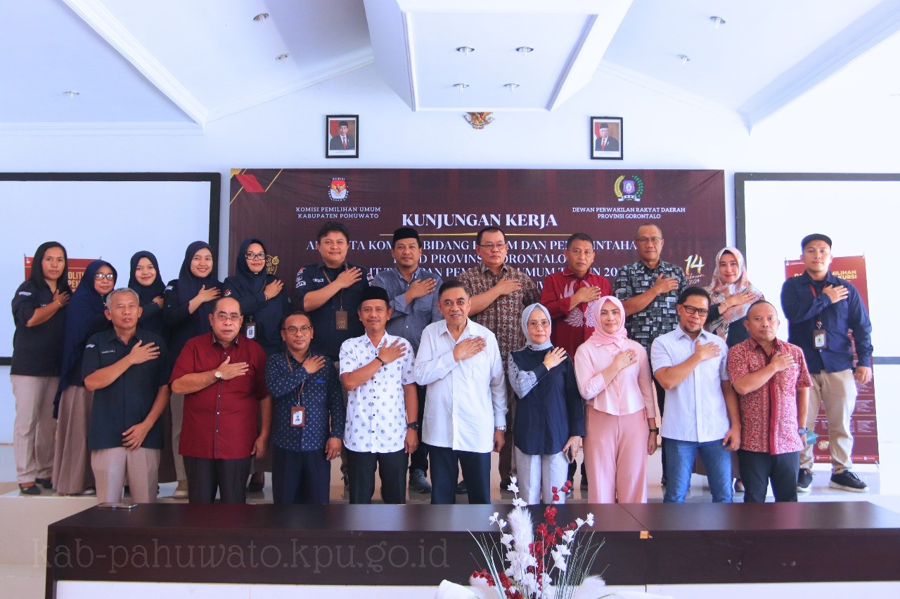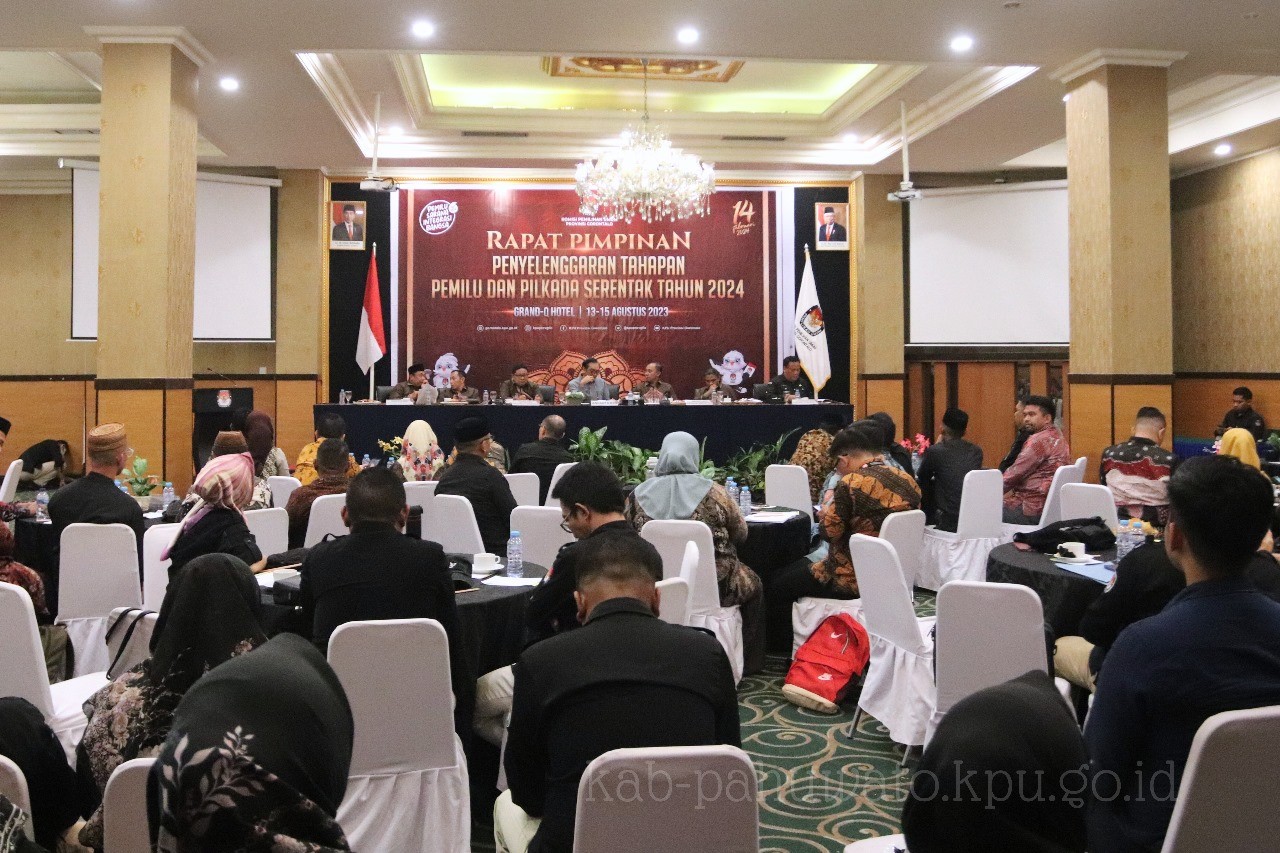 Pohuwato, kab-pahuwato.kpu.go.id - Ketua KPU Kabupaten Pohuwato Firman Ikhwan, bersama Anggota KPU Kabupaten Pohuwato Dian Fadjriyanti Pakaya, Iskandar Ibrahim, Iwan Dolongseda dan Usman Dunda, serta Sekretaris KPU Kabupaten Pohuwato Sjukri Hala bersama Kasubbag Yatik Kalil, Slamet Ramelan, Suwarno Amili dan Syafrianto Abd. Rahman menghadiri pembukaan kegiatan Rapat Pimpinan Tahapan Penyelenggaraan Pemilu dan Pilkada Serentak tahun 2024, di Grand-Q Hotel, Kota Gorontalo, Minggu (13/8). Ketua KPU Provinsi Gorontalo Fadliyanto Koem dalam sambutannya menyampaikan bahwa kegiatan Rapim merupakan kali kedua penyelenggaraannya di Provinsi Gorontalo. Dari Rapim ini, diharapkan akan lebih memberikan input dan masukan bagi penyelenggaraan pemilu dan pilkada di Gorontalo melalui selama tiga hari pelaksanaannya. “Dari tiga hari pelaksanaan Rapim, kami berharap akan meningkatkan konsolidasi antar penyelenggara dan memberi dampak yang baik dalam penyelenggaraannya,” kata Fadliyanto Koem. Sementara itu, Anggota KPU Republik Indonesia Yulianto Sudrajat membuka kegiatan dan didaulat menyampaikan Kebijakan Penganggaran Pilkada Tahun 2024. Yulianto Sudrajat menyampaikan penyelenggaraan Pemilu 2024 juga sebagai persiapan KPU provinsi dan KPU Kabupaten/kota dalam penyelenggaraan Pilkada 2024. Terkait pilkada, Drajat meminta jajaran penyelenggara daerah mulai menyiapkan perencanaan, salah satunya anggaran yang dituangkan dalam NPHD. Kegiatan ini dirangkaikan dengan penandatanganan perjanjian kinerja tahun 2023 di lingkup KPU Se-Provinsi Gorontalo. Dilanjutkan pemaparan materi Anggota Bawaslu Provinsi Gorontalo terkait Pengawasan dan Indeks Kerawanan Pemilu dan Pilkada Serentak Pemilu 2024. Turut hadir, Ketua dan Anggota KPU Provinsi Gorontalo, Sekretaris KPU Provinsi Gorontalo, Ketua dan Anggota KPU Kabupaten/Kota se-Provinsi Gorontalo, Pejabat Eselon III dan Eselon IV di Lingkungan Sekretariat KPU Provinsi Gorontalo dan Sekretariat KPU Kabupaten/Kota se-Provinsi Gorontalo, dan Operator Siparmas. (***)