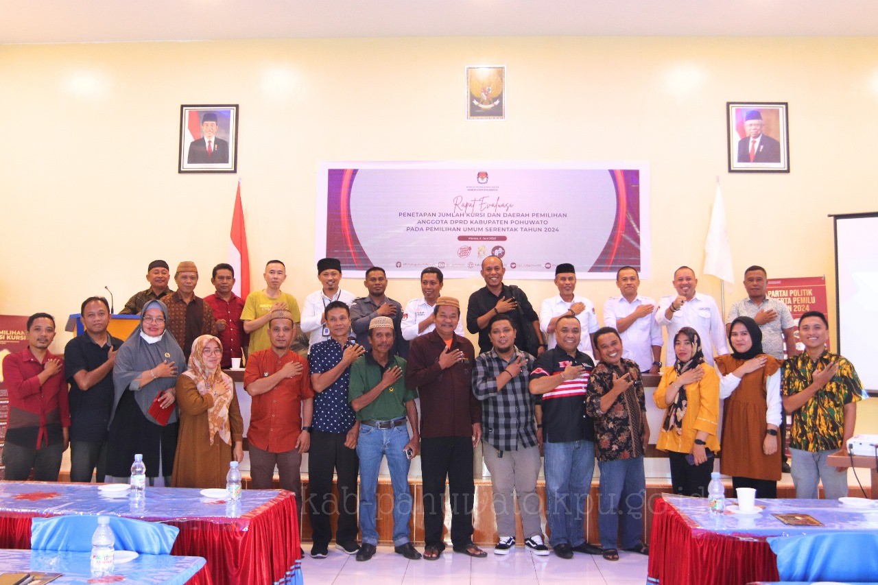 Pohuwato, kab-pahuwato.kpu.go.id - KPU Kabupaten Pohuwato gelar Rapat Evaluasi penetapan jumlah kursi dan daerah pemilihan anggota DPRD kabupaten pohuwato pada pemilihan umum serentak tahun 2024, di Sunrise Hotel & Home Stay, Pohuwato, Senin (05/06/2023). Dalam kesempatan ini, Ketua KPU Pohuwato Rinto W. Ali menyampaikan bahwa terdapat perubahan komposisi Daerah Pemilihan dan Alokasi Kursi dari pemilu sebelumnya. “Dapil Kabupaten Pohuwato Pemilu 2024 dibagi menjadi 5 Dapil yaitu Dapil Pohuwato 1 Marisa Buntulia, Dapil Pohuwato 2 Paguat Dengilo, Dapil Pohuwato 3 Lemito, Dapil Wanggarasi, Popayato, Popayato Timur, Popayato Barat, Dapil Pohuwato 4 Randangan Taluditi, dan Dapil Pohuwato 5 Duhiadaa Patilanggio, yang disusun berdasarkan 7 prinsip penataan Dapil, dengan jumlah alokasi kursi anggota DPRD sebanyak 25 kursi.”, Terang Rinto. Penataan Dapil dan alokasi kursi anggota DPRD Kabupaten Pohuwato, kata Rinto, telah ditetapkan dan disahkan oleh KPU melalui PKPU Nomor 6 Tahun 2023 tentang Daerah Pemilihan dan Alokasi Kursi Anggota Dewan Perwakilan Rakyat, Dewan Perwakilan Rakyat Daerah Provinsi, dan Dewan Perwakilan Rakyat Daerah Kabupaten/Kota Dalam Pemilihan Umum Tahun 2024. Akademisi, Dr. Ramli Mahmud, S.Pd.,M.A yang menjadi narasumber dalam kegiatan ini menyampaikan materi Pemilu Berintegritas Dalam Bingkai PKPU Nomor 6 Tahun 2022. Turut hadir Anggota KPU Pohuwato, Bawaslu Pohuwato, Perwakilan Partai Politik tingkat Kabupaten Pohuwato, Kepala Desa Marisa Selatan, Plt. Kepala Desa Taluduyunu, BPD, Tokoh Masyarakat, Tokoh Adat, Tokoh Perempuan Kecamatan Marisa dan Buntulia. (***)