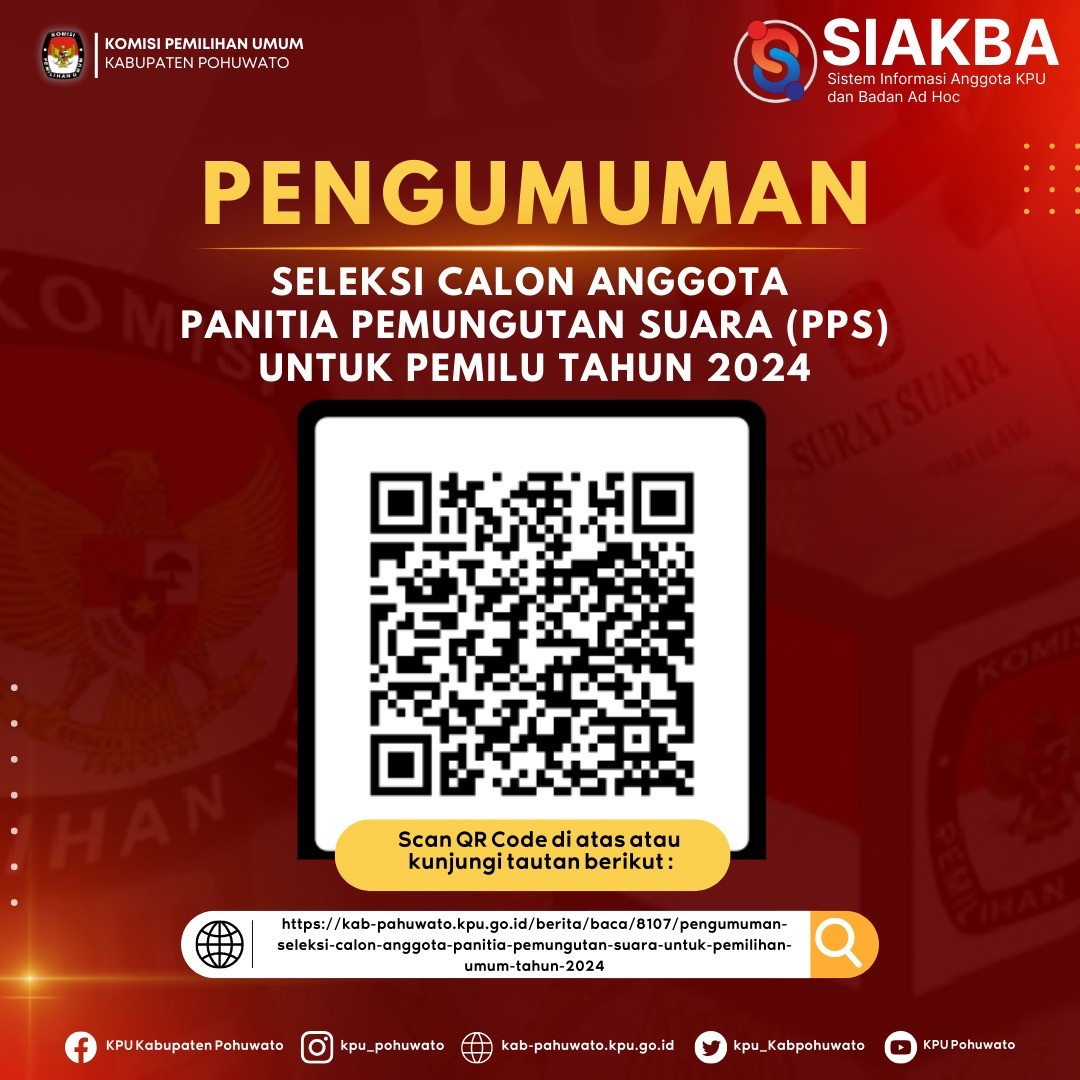 Sehubungan dengan hal tersebut, KPU Kabupaten Pohuwato.membuka penerimaan pendaftaran bagi calon anggota PPS sejak tanggal 18 Desember 2022 dan akan berakhir pada tanggal 30 Desember dengan ketentuan sebagai berikut: