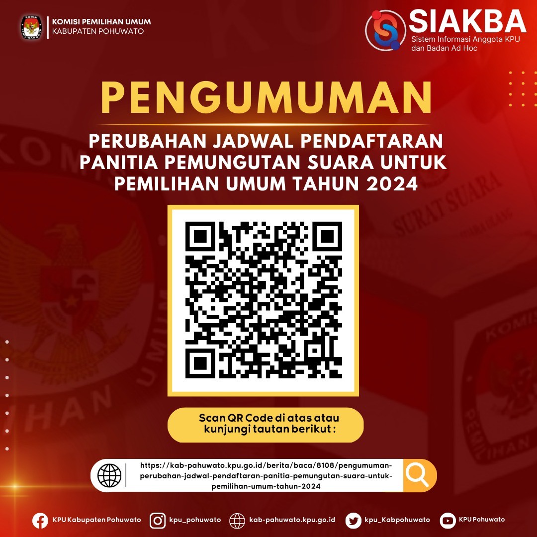 Pengumuman dan lampiran dapat diunduh pada : Perubahan Jadwal Pendaftaran Panitia Pemungutan Suara Untuk Pemilihan Umum tahun 2024