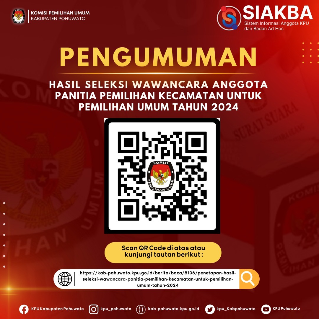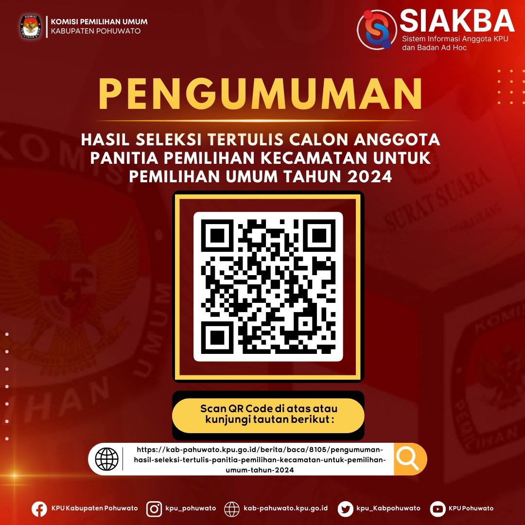 Pohuwato, https://kab-pahuwato.kpu.go.id/ - Berdasarkan Berita Acara Rapat Pleno KPU Kabupaten Pohuwato Nomor 63 Tahun 2022 tanggal 7 Desember 2022 tentang Rapat Pleno Penetapan Hasil Seleksi Ujian Tertulis Panitia Pemilihan Kecamatan untuk Pemilu Tahun 2024, disampaikan hal-hal sebagai berikut: KPU Kabupaten Pohuwato telah melaksanakan tahapan seleksi Ujian Tertulis pembentukan Panitia Pemilihan Kecamatan untuk Pemilu Tahun 2024 pada tanggal 6 Desember 2022; KPU Kabupaten Pohuwato menetapkan hasil seleksi Ujian Tertulis pembentukan Panitia Pemilihan Kecamatan untuk Pemilu Tahun 2024 sebagaimana daftar terlampir; Sehubungan dengan hal tersebut di atas, KPU Kabupaten Pohuwato mengundang calon anggota Panitia Pemilihan Kecamatan yang dinyatakan Memenuhi Syarat dan Lulus tahap seleksi Tertulis untuk hadir dalam Seleksi Wawancara pada: Hari, Tanggal : Minggu - Selasa, 11-13 Desember 2022 Pukul : 08.00 wita s/d selesai Tempat : Jadwal Terlampir Pakaian : Kemeja putih, Rok/Celana Hitam Calon anggota Panitia Pemilihan Kecamatan mengikuti seleksi Wawancara dengan ketentuan: Membawa KTP-Elekktronik Menggunakan Masker dan Mengikuti Protokol Kesehatan Covid 19 Melakukan registrasi dan mengisi kehadiran paling lambat 30 menit sebelum ujian dimulai. Demikian pengumuman ini disampaikan untuk diketahui. Pengumuman Hasil Seleksi Tertulis dapat di unduh pada : Hasil Seleksi Tertulis Calon Anggota PPK Kabupaten Pohuwato pada Pemilu 2024