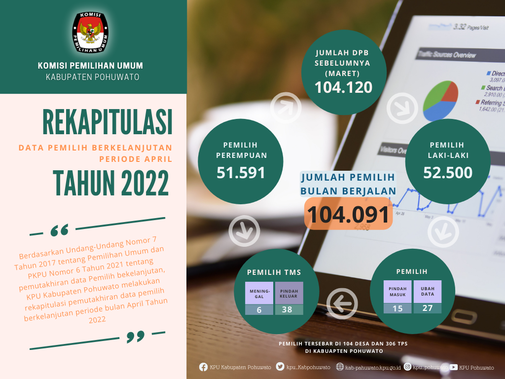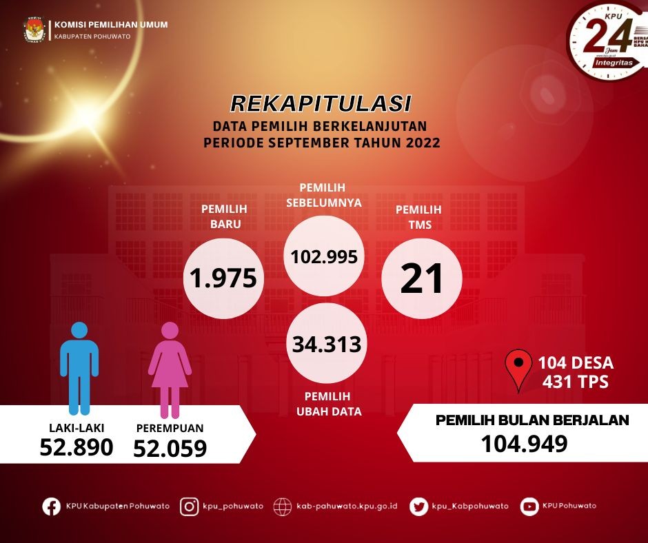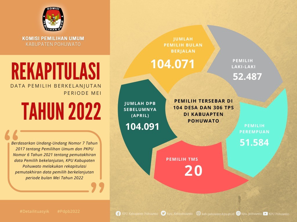 Berdasarkan Berita Acara Nomor 19/HK.03.1/7504/2022 tentang Rapat Pleno Pemutakhiran Data Pemilih Berkelanjutan periode Mei Tahun 2022, daftar pemilih berkelanjutan ditetapkan dengan jumlah 104.071 pemilih. Rinciannya: pemilih laki-laki 52,487 dan perempuan berjumlah 51,584 pemilih, tersebar di 13 (tiga belas) Kecamatan dan 104 Desa/Kelurahan.