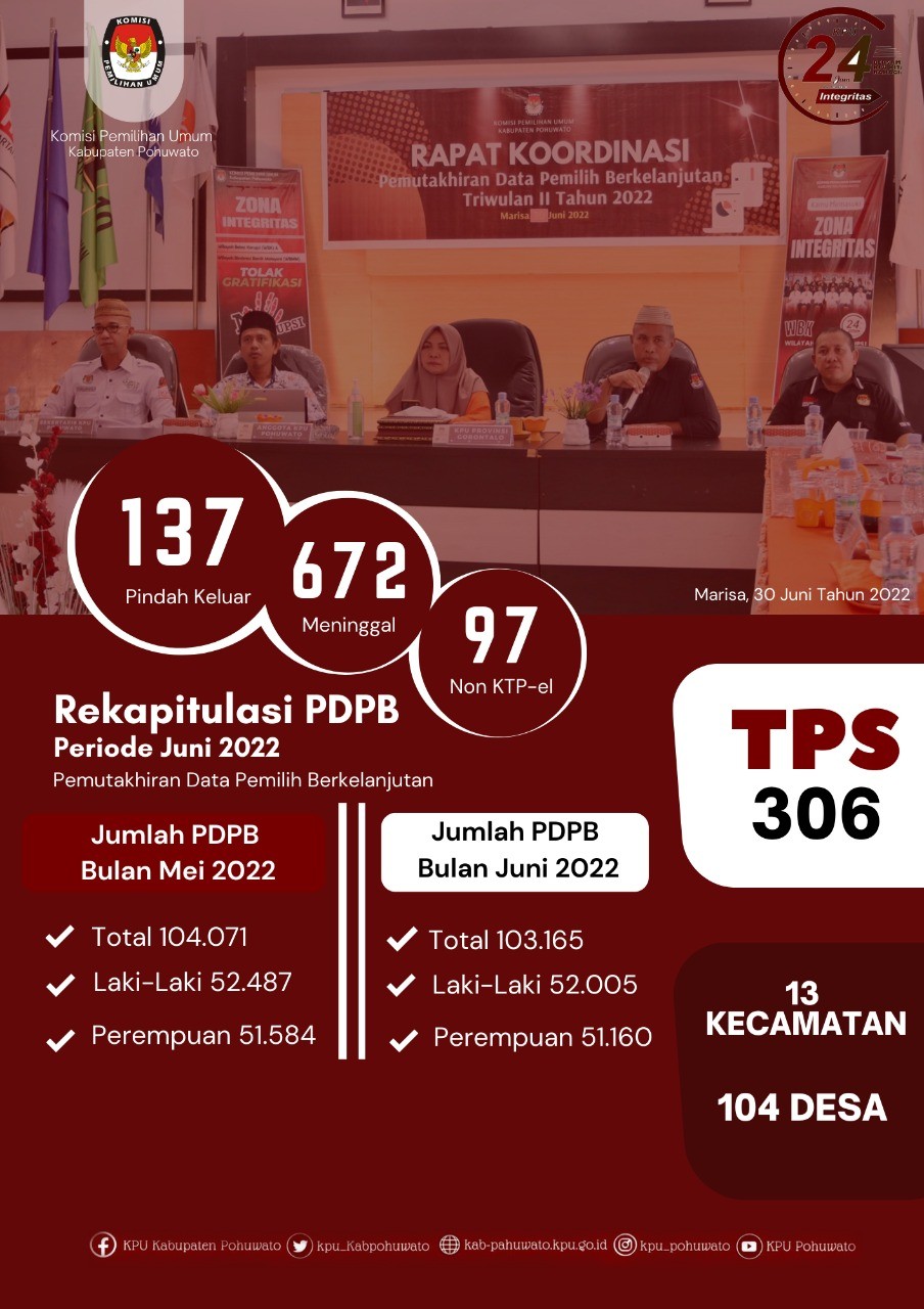 Pohuwato - KPU Kabupaten Pohuwato memutakhirkan data pemilih berkelanjutan periode Mei 2022. Penetapan update data pemilih dilakukan KPU Pohuwato melalui Rapat Pleno Pemutakhiran dan Rekapitulasi Data Pemilih Berkelanjutan tingkat Kabupaten Pohuwato, Senin (30/5/2022).