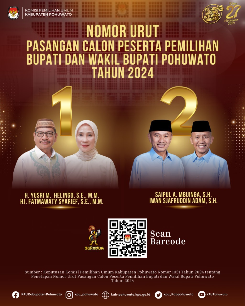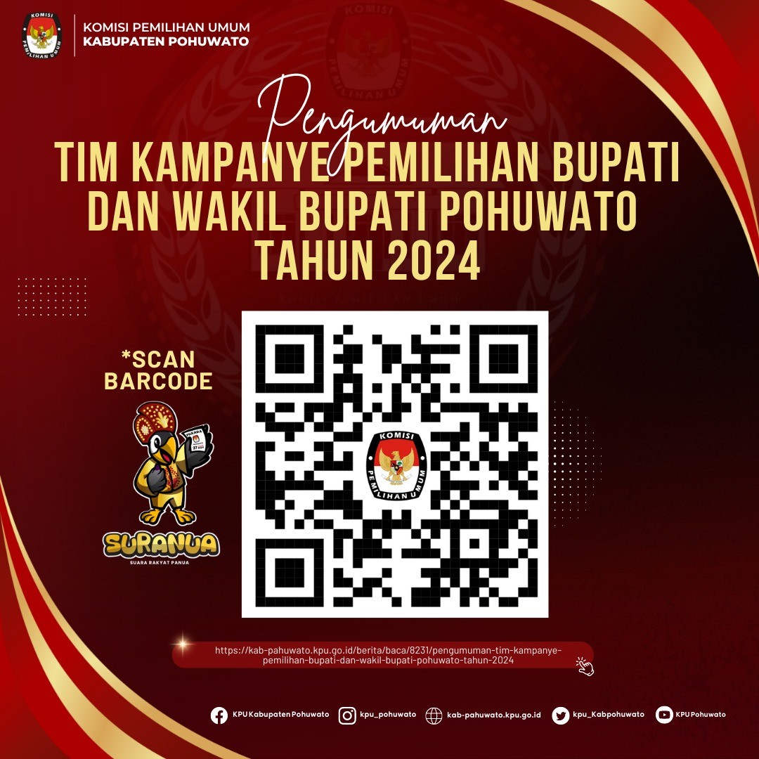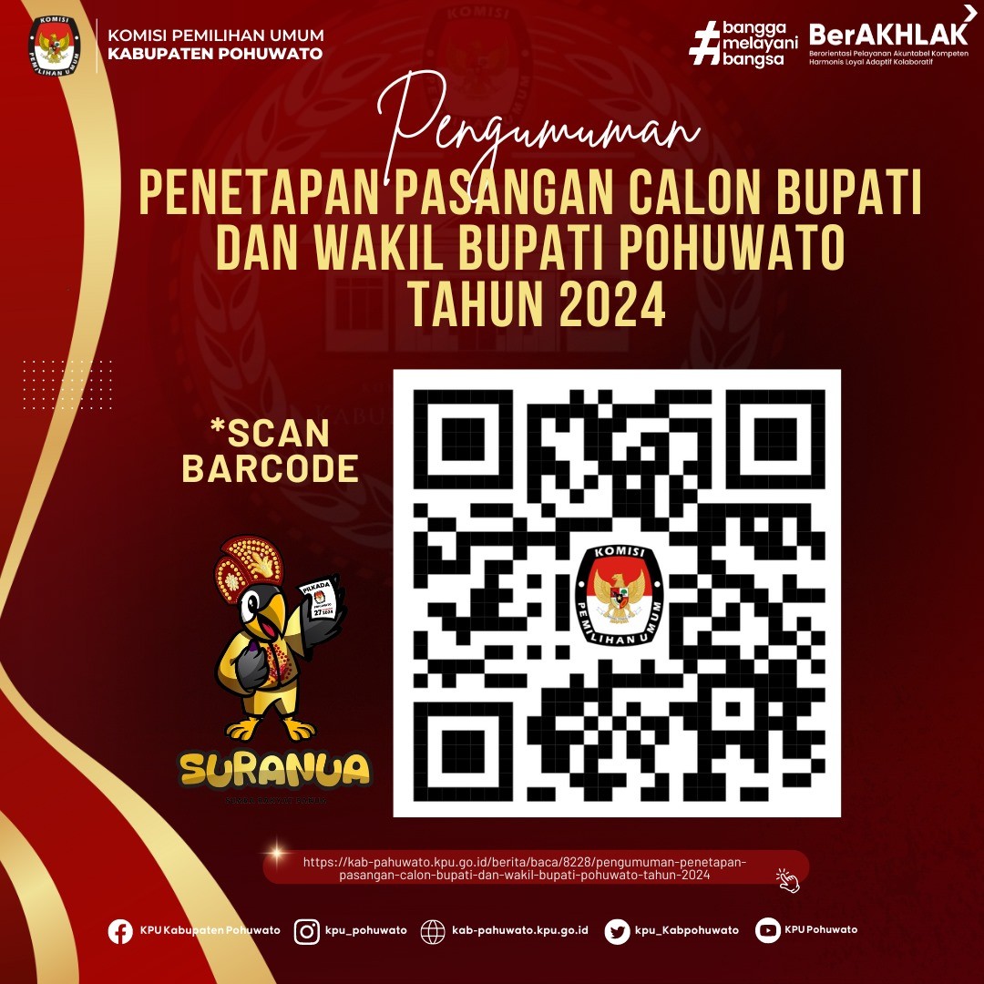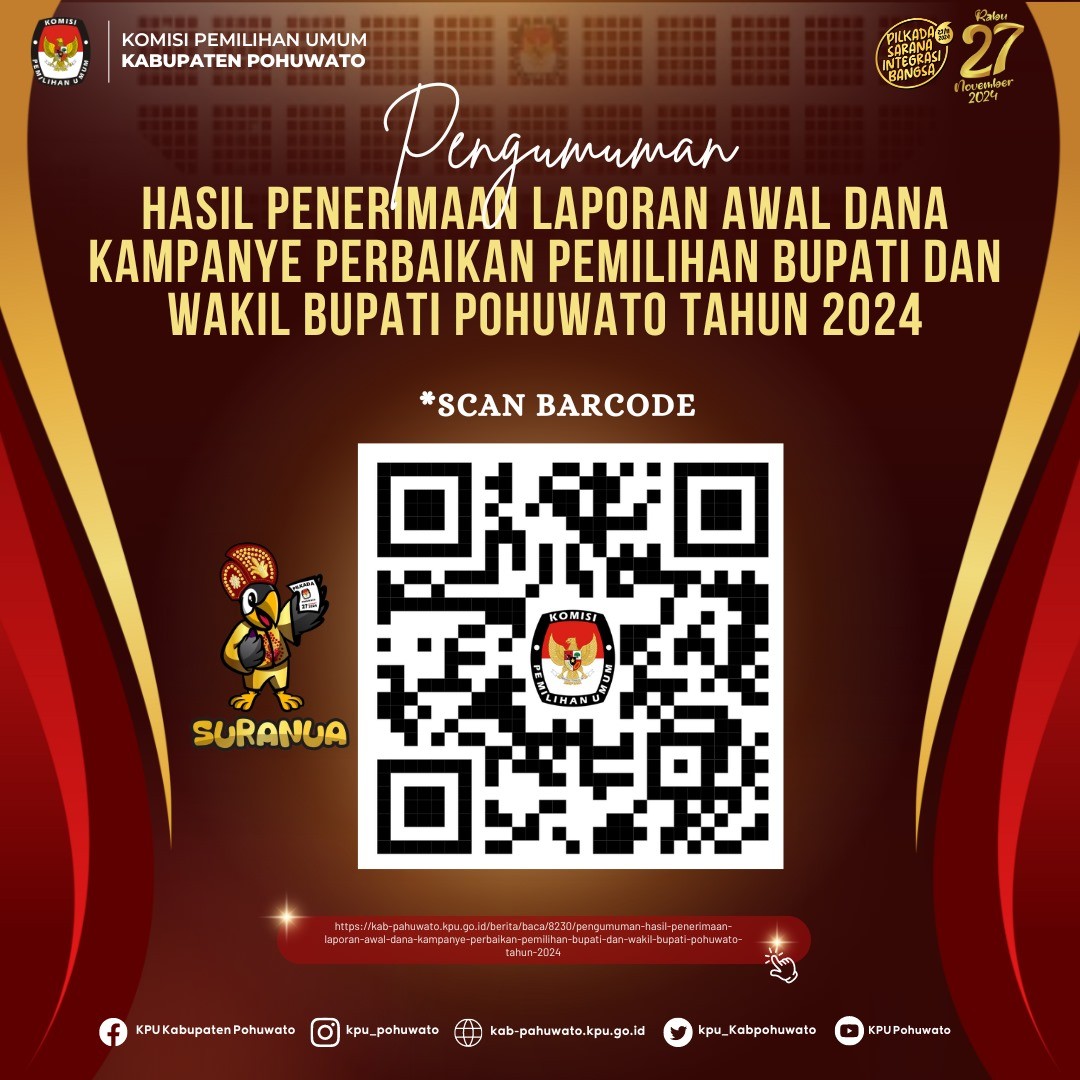 Pohuwato, kab-pahuwato.kpu.go.id - Bahwa untuk melaksanakan ketentuan Pasal 137 Peraturan KPU Nomor 8 Tahun 2024 tentang Pencalonan Gubernur dan Wakil Gubernur, Bupati dan Wakil Bupati, serta Walikota dan Wakil Walikota sebagaimana diubah dengan Peraturan KPU Nomor 10 Tahun 2024 tentang Perubahan Atas Peraturan KPU Nomor 8 Tahun 2024 tentang Pencalonan Gubernur dan Wakil Gubernur, Bupati dan Wakil Bupati, serta Walikota dan Wakil Walikota, Komisi Pemilihan Umum Kabupaten Pohuwato mengumumkan Penerimaan Masukan dan Tanggapan Masyarakat terhadap Pasangan Calon Bupati dan Wakil Bupati Kabupaten Pohuwato.