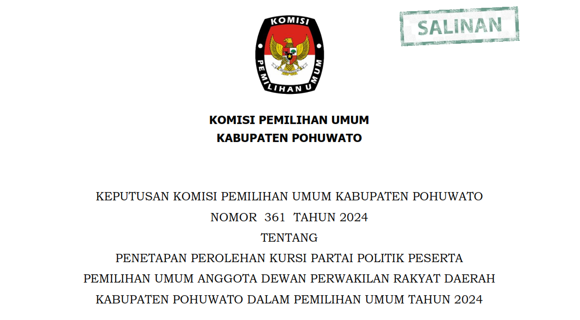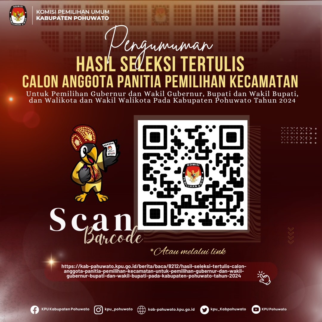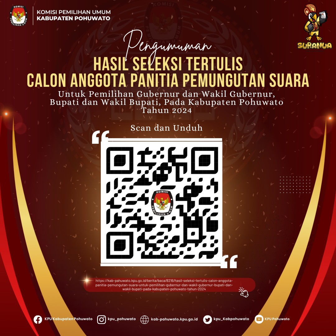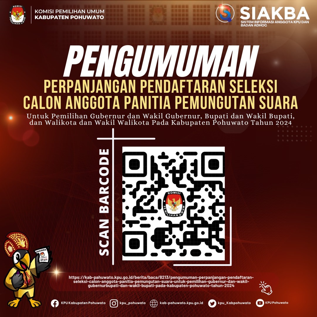 Sehubungan dengan hal tersebut, KPU Kabupaten Pohuwato membuka perpanjangan waktu pendaftaran seleksi calon anggota PPS sejak tanggal 09 Mei 2024 sampai dengan tanggal 11 Mei 2024 pada desa/kelurahan sebagaimana terlampir dalam pengumuman ini.