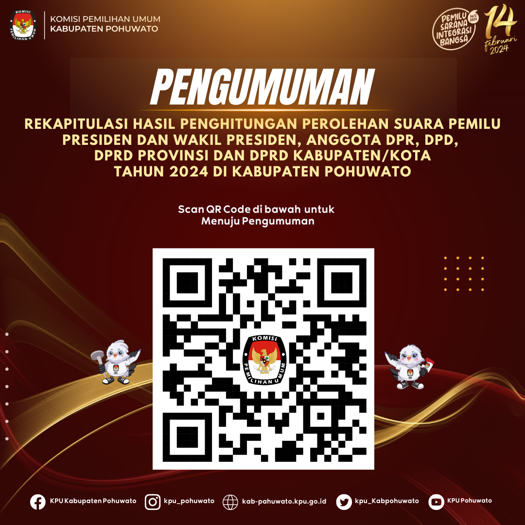 Pohuwato, https://kab-pahuwato.kpu.go.id/- Berdasarkan hasil rapat pleno terbuka rekapitulasi hasil penghitungan perolehan suara Pemilu Presiden dan Wakil Presiden, anggota DPR, DPD, DPRD Provinsi, dan DPRD kabupaten di Kabupaten Pohuwato, maka bersama ini Komisi Pemilihan Umum Kabupaten Pohuwato mengumumkan Hasil Rekapitulasi penghitungan perolehan suara Pemilu Presiden dan Wakil Presiden, anggota DPR, DPD, DPRD Provinsi, dan DPRD kabupaten/kota Tahun 2024 di Kabupaten Pohuwato sebagaimana terlampir.